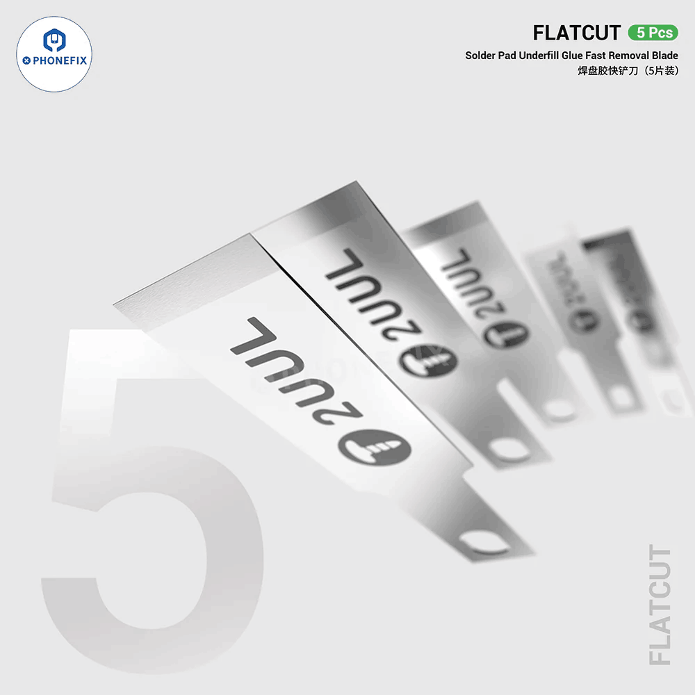 2UUL DA28 FlatCut Solder Pad Underfill Glue Quick Removal Blade (5 шт./коробка), подходит для очистки и удаления клея с печатных плат процессоров мобильных телефонов, не повредит материнскую плату или чип процессора. 2UUL DA28 Mobile Phone Motherboard BGA Chip Repair Knife — это быстрый скребок, предназначенный для удаления остатков клея и припоев на печатных платах и печатных платах процессоров мобильных телефонов, легко очищается.