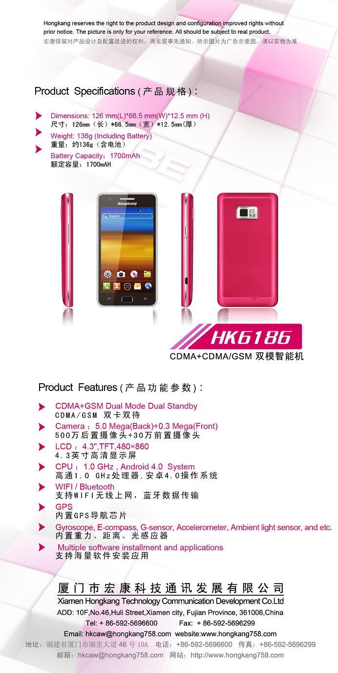 | Android 4.0smart mobile phone,Two cards Dual Standby CDMA450MHz,suit for skylink,multi language Russian | Model:HK6186 Type:Smart PhoneDual Mode & Dual StandbyKey Features:Android 4.0, 3G (CDMA),1.0GHz, 4.3''TFT Products Specifications: NetworkCard ... |