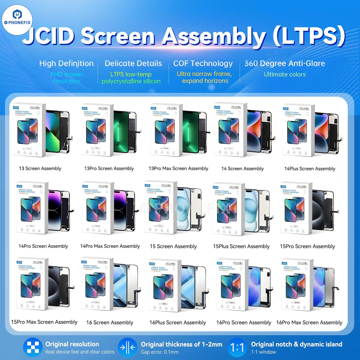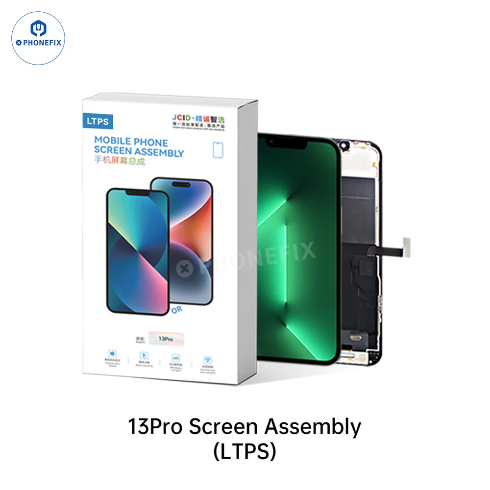 JCID Normal LTPS Screen Assembly for iPhone 12/13/14/15/16 Pro Max Display Replacement. JCID Screen Assembly (LTPS) with FHD screen resolution, LTPS, COF technology and 360 degree anti-glare for iPhone 11-16 Pro Max screen replacement. Support transplanting screen IC to remove pop-up windows from the iPhone.
