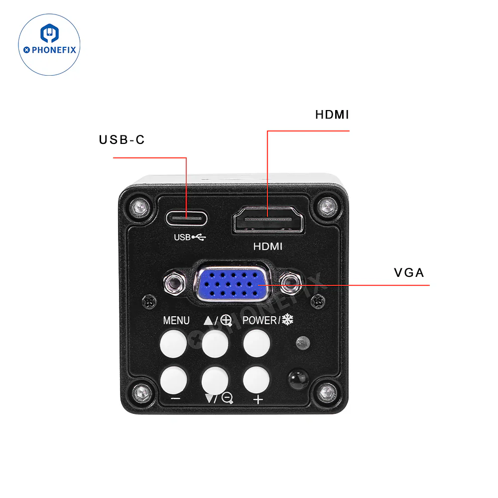 H2630VT-D50 2MP HD Industrial Camera with HDMI VGA Tape-C 3 simultaneous output interfaces, 1/3 inch @ 60FPS, 2.8UM*2.8UM pixel size, supports electronic zoom, 8 resolutions and 10 languages. CS lens mount is compatible with most trinocular stereo microscopes. It's ideal for repairing mobile s, laptops, tablets, and motherboard BGA chips.